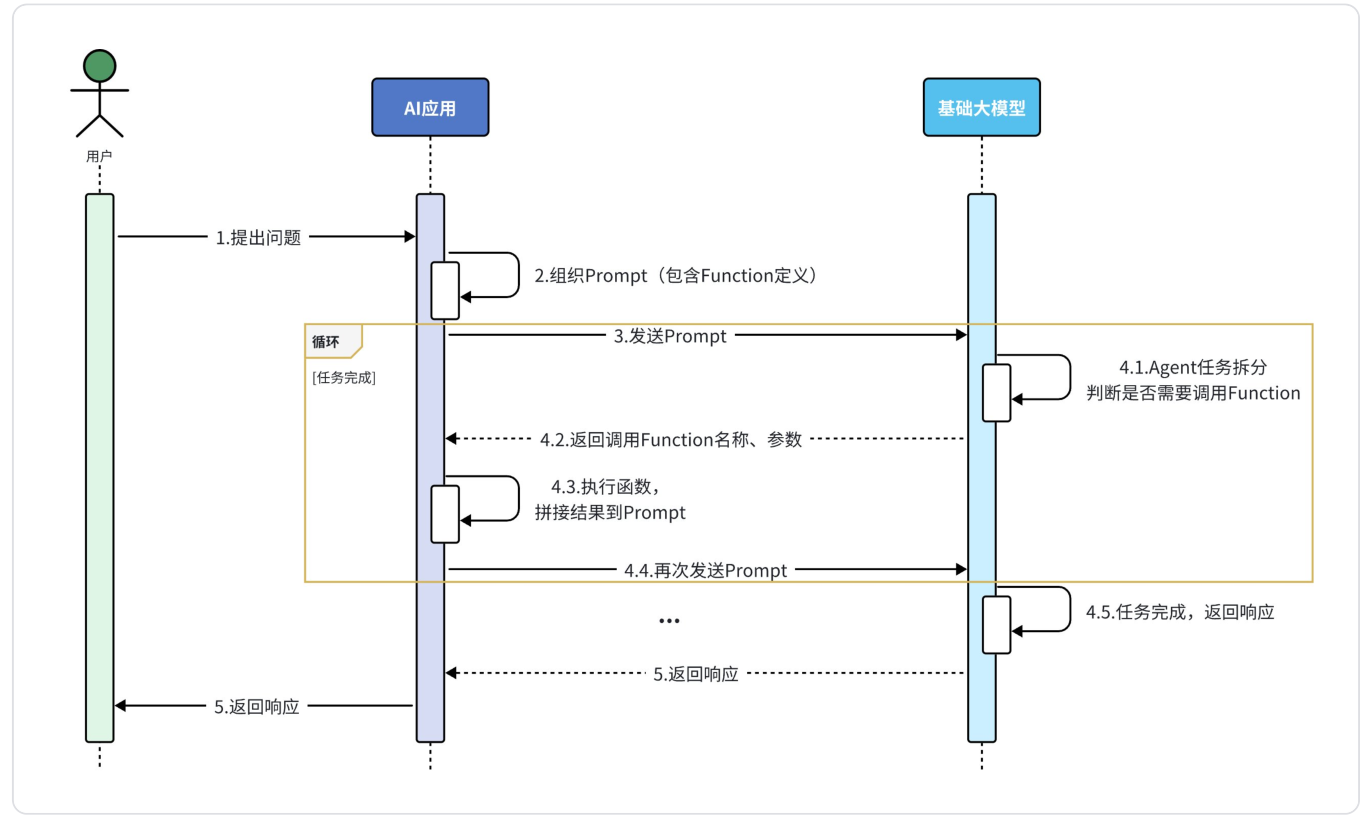 - 在提示词中描述用户的需求 和 每个函数的作用,需要 AI 理解用户意图,判断调用哪个函数,并将任务拆分为多个步骤(Agent)。